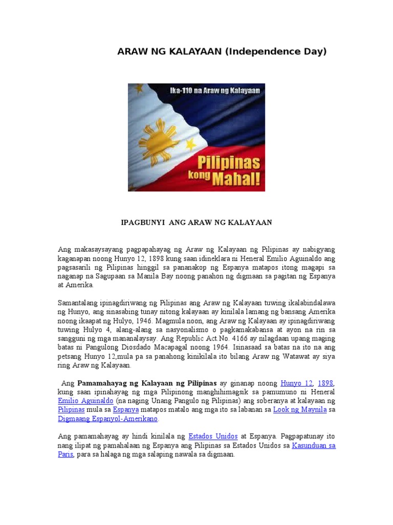 In celebration of independence day, araw explores its cultural heritage further. Isang pagpupugay po sa bawat pilipino, sa katatagan ng loob at pagpupunyagi sa gitna ng krisis na ito. Araw ng republikang filipino 1898. Philippine independence day) is the philippine national day and republic day, which is celebrated on 12 june. Itong kalayaan, atin ngang isipin kung nasusunod mo ang mga tuntunin;